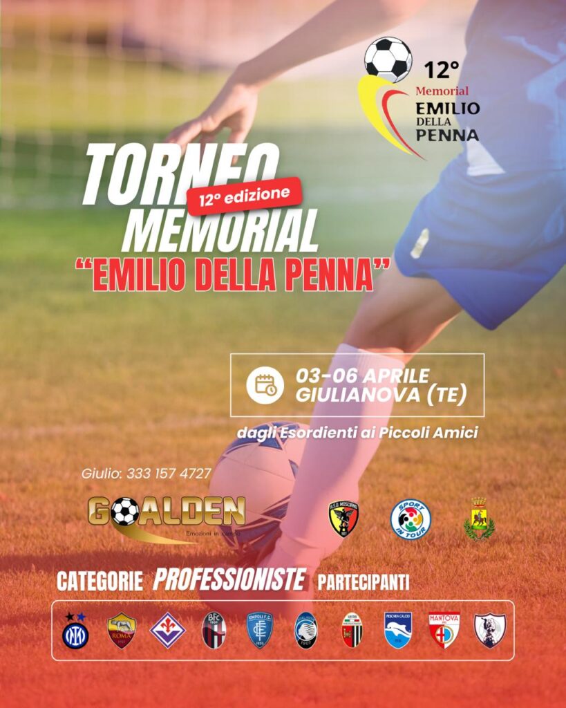 Dal 3 al 6 aprile Giulianova accoglierà società, allenatori, famiglie e giovani atleti pronti a vivere quattro giorni di calcio vero, di quelli che lasciano il segno. Con la partecipazione delle migliori società dilettantistiche e di società professionistiche come il Pescara Calcio, Ascoli Calcio, Sambenedettese, Empoli FC, Atalanta, AS Roma, Bologna FC, Fiorentina, Inter FC. Il Memorial “Emilio Della Penna” è un’occasione per crescere, confrontarsi e trasformare la passione in ricordi destinati a durare. Dagli Esordienti ai Piccoli Amici, ogni categoria avrà il suo spazio e il suo momento di gloria. La presentazione del programma dettagliato dei tre giorni sarà la mattina di sabato 28 marzo nella sala comunale “Bruno Buozzi” di Giulianova alta.