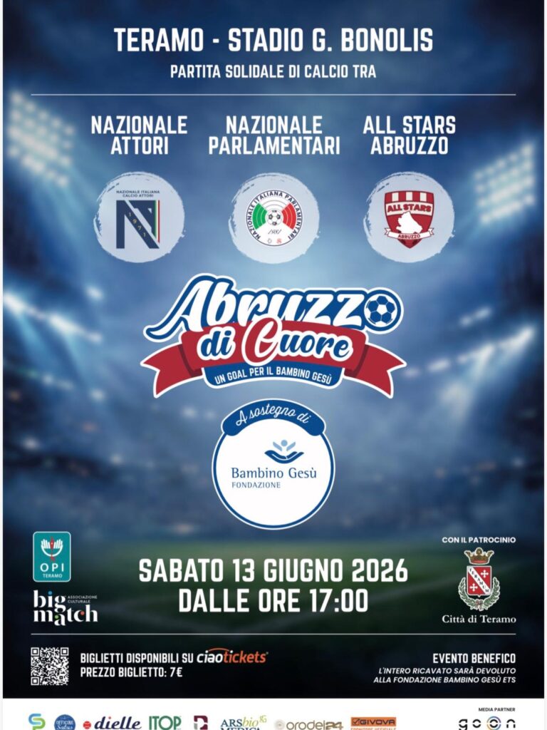 TERAMO – Lo sport si mette al servizio della solidarietà. Sabato 13 giugno 2026, lo Stadio G. Bonolis ospiterà la nuova edizione di “Abruzzo di Cuore – Un goal per il Bambino Gesù”, una partita solidale di calcio che vedrà protagoniste tre formazioni d’eccezione: la Nazionale Attori, la Nazionale Parlamentari e le All Stars Abruzzo.