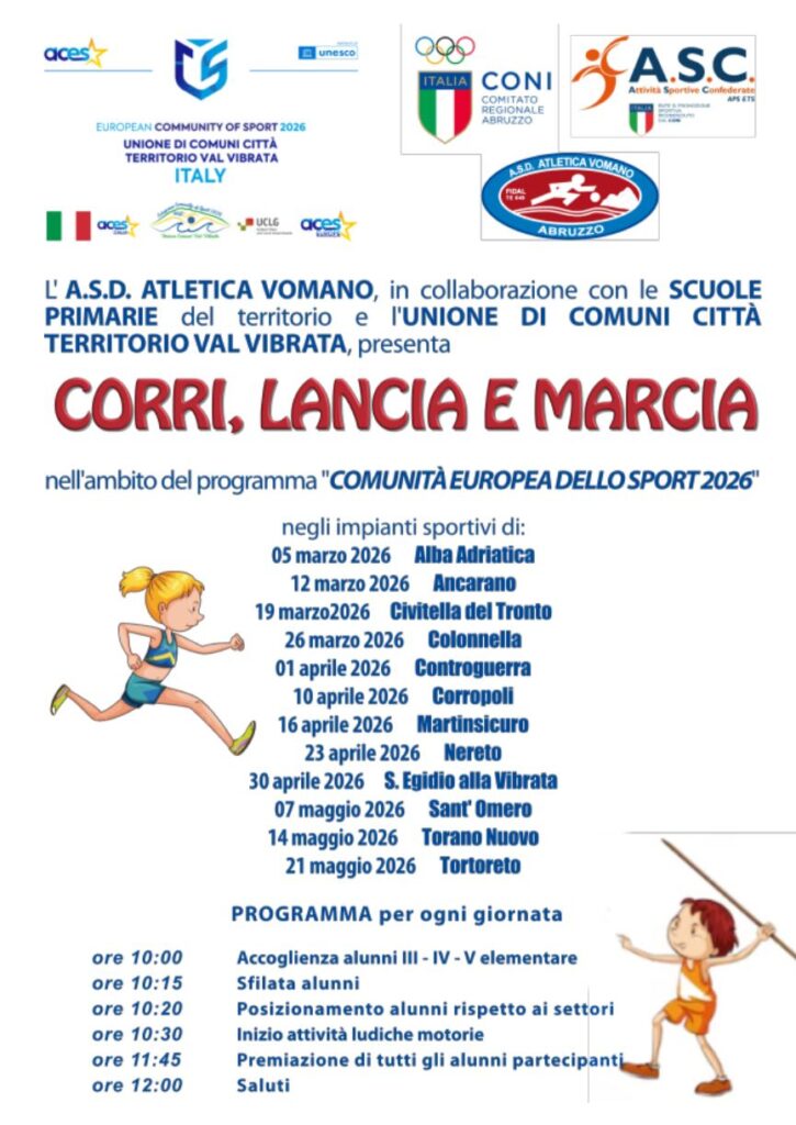 L’A.S.D. Atletica Vomano, in una sinergia virtuosa con le scuole primarie locali e l’Unione di Comuni Città Territorio Val Vibrata, annuncia il lancio dell’iniziativa “Corri, Lancia e Marcia”. Il progetto si inserisce nel prestigioso contesto di “Comunità Europea dello Sport 2026”, puntando a promuovere i valori dello sport e della salute tra i più giovani.